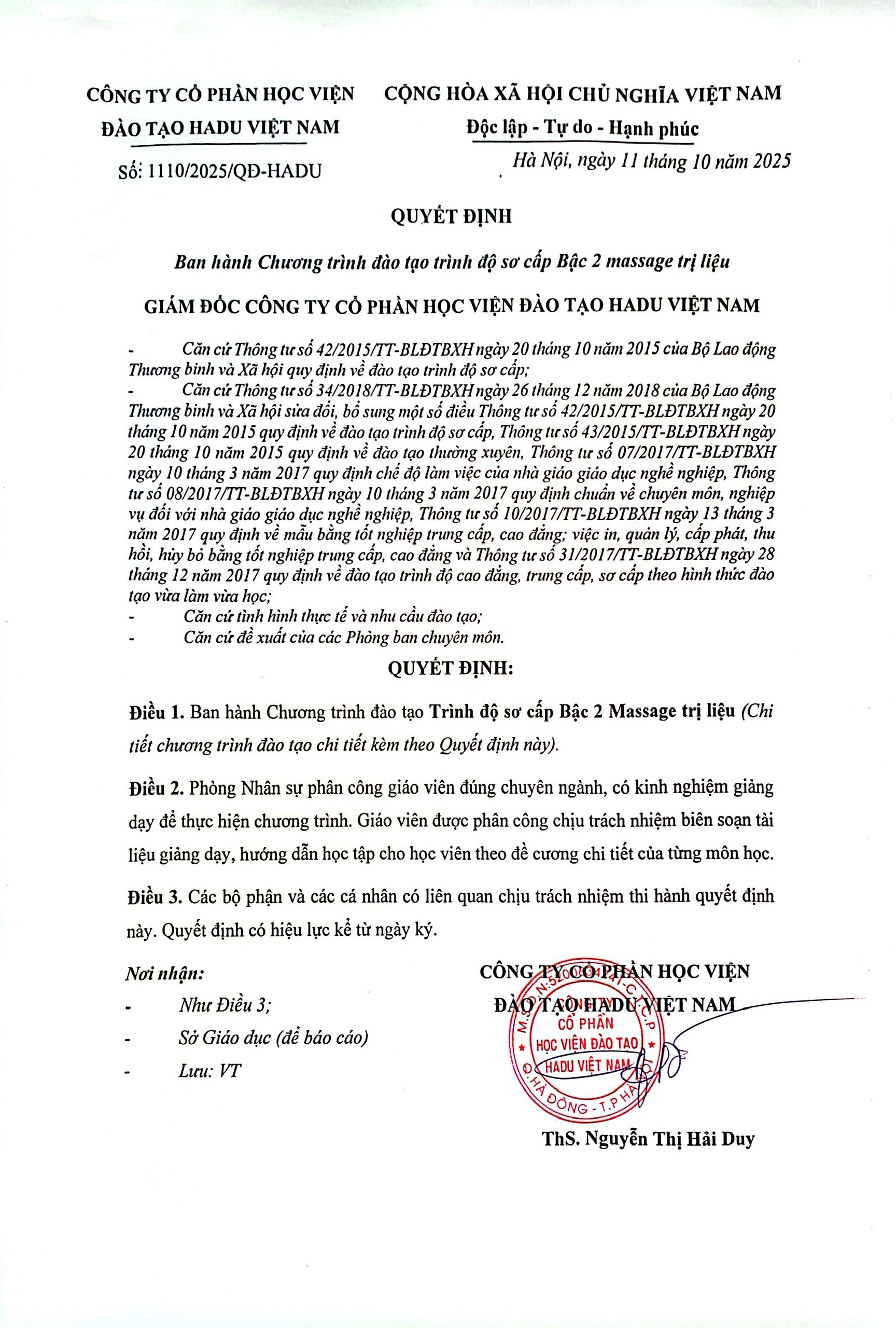 Học viện Đào tạo HaDu Việt Nam chính thức công bố Quyết định về việc ban hành chương trình đào tạo chính quy dành cho chuyên ngành Massage trị liệu. Đây là bước tiến quan trọng trong việc chuẩn hóa chất lượng đào tạo, giúp học viên vững nghề và đáp ứng các tiêu chuẩn nghề nghiệp hiện hành.