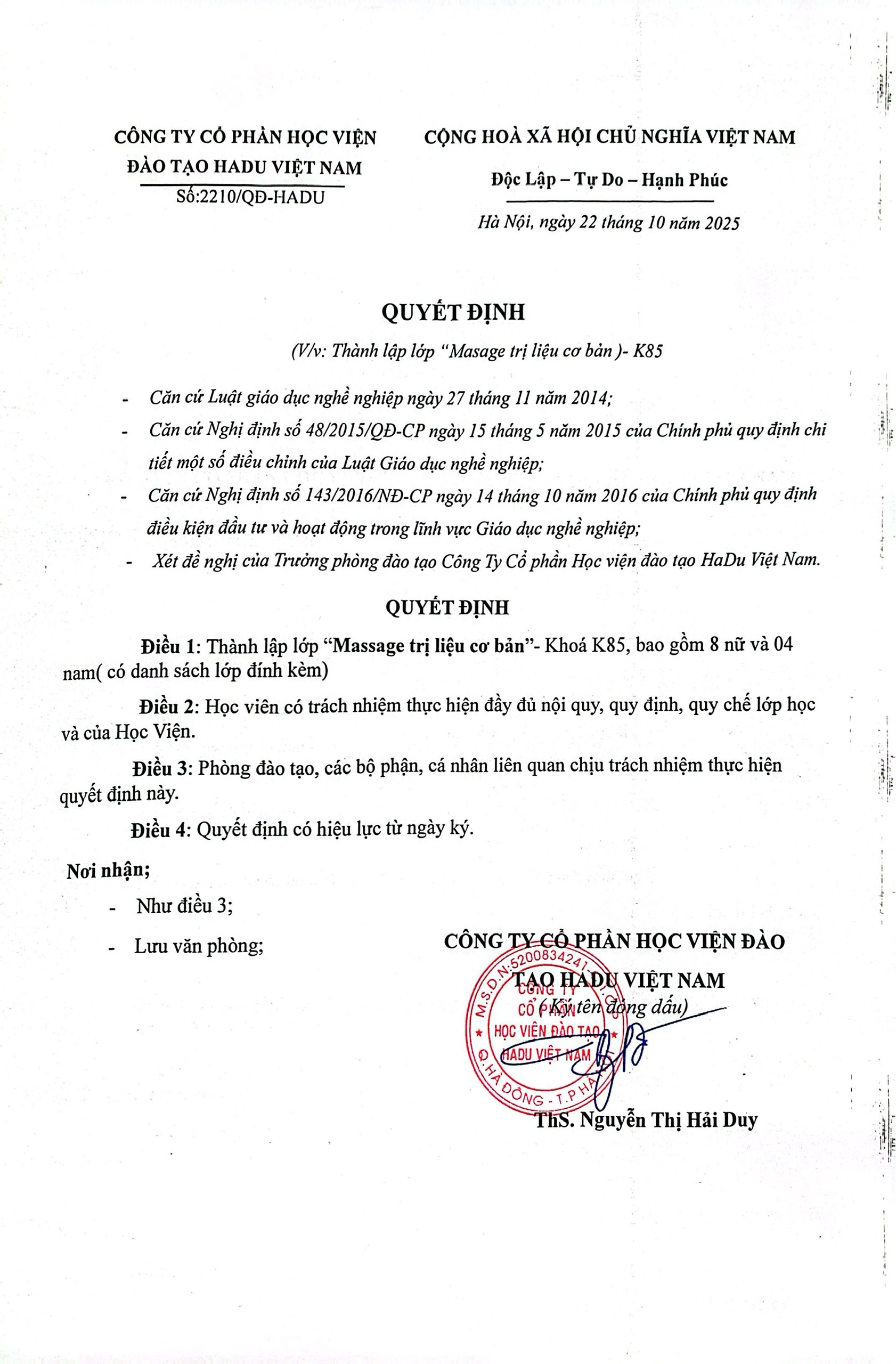 Công ty Cổ phần Học viện Đào tạo HaDu Việt Nam trân trọng thông báo về việc ban hành Quyết định thành lập lớp "Massage trị liệu cơ bản" - Khóa K85.